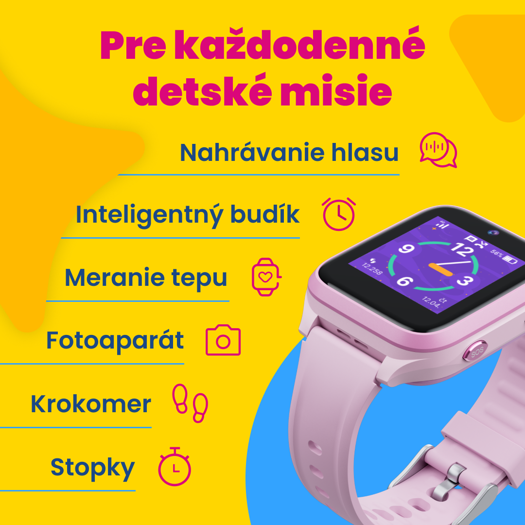 Foťák 2 Mpx, měření tepu, krokoměr, budík, školní režim a SOS tlačítko.
